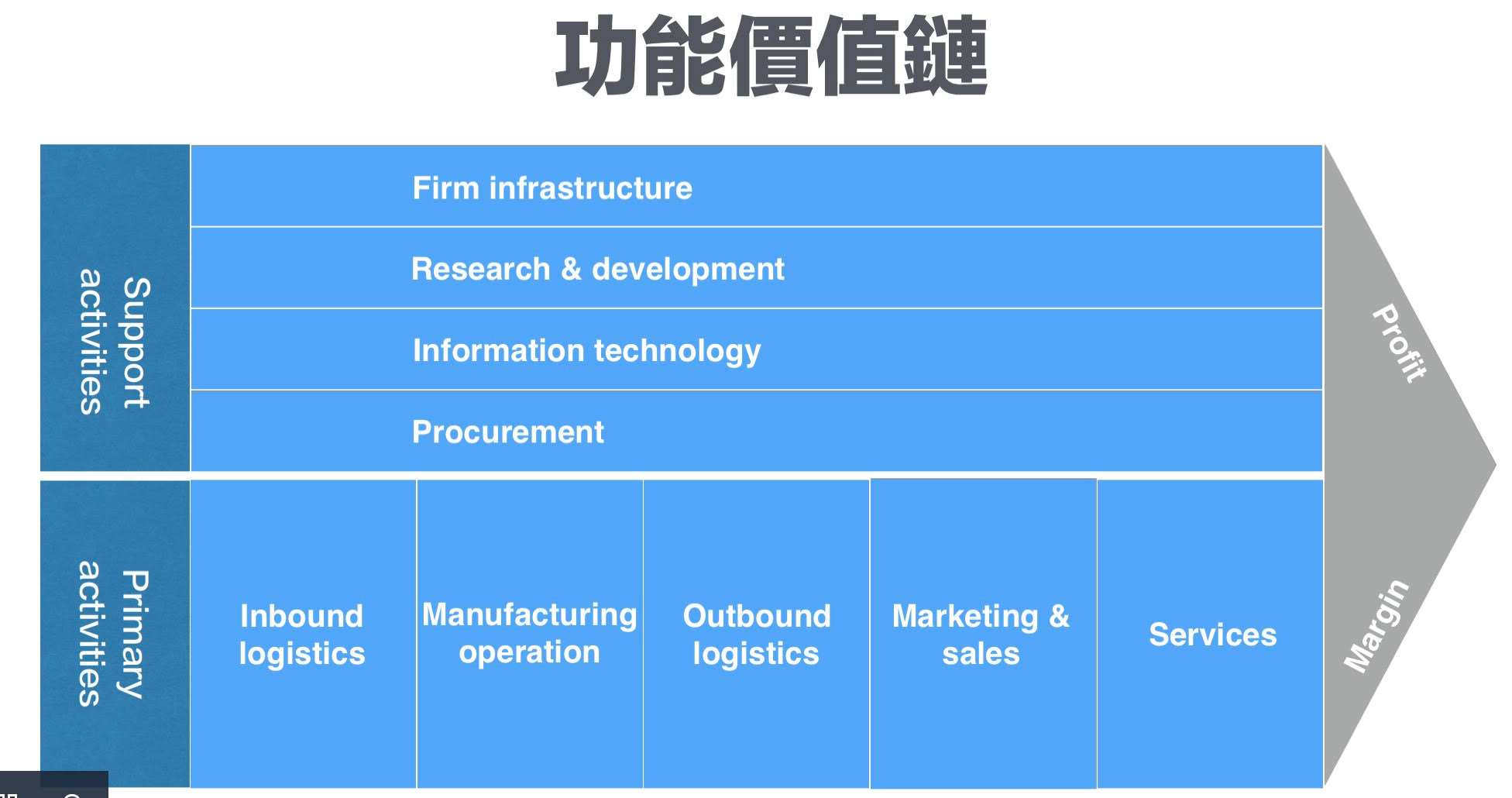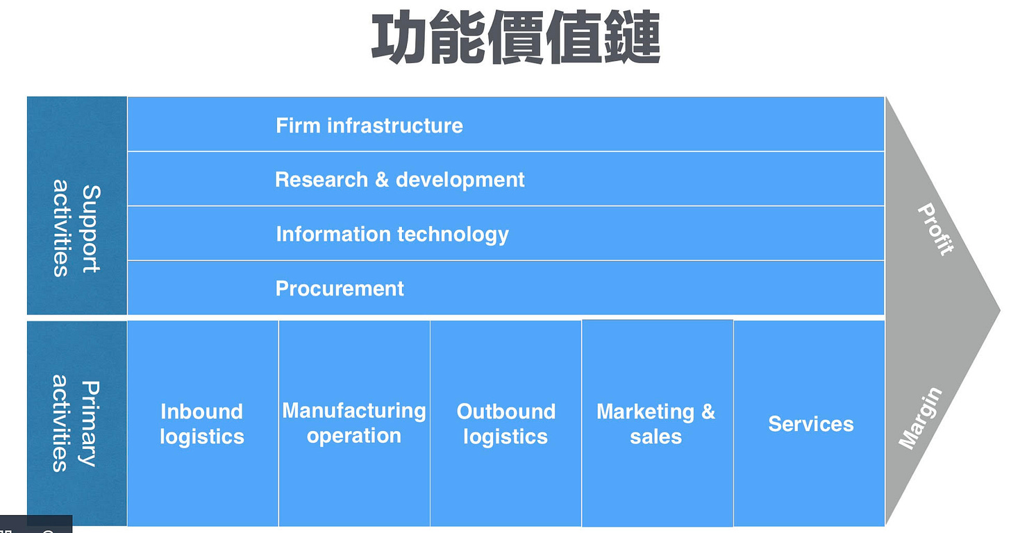 我將波特的這個價值鏈稱為「功能價值鏈」(Function Value Chain)。因為從一個企業組織來看,這些都是「功能部門」,同時也藉以和「產品價值鏈」做區分。