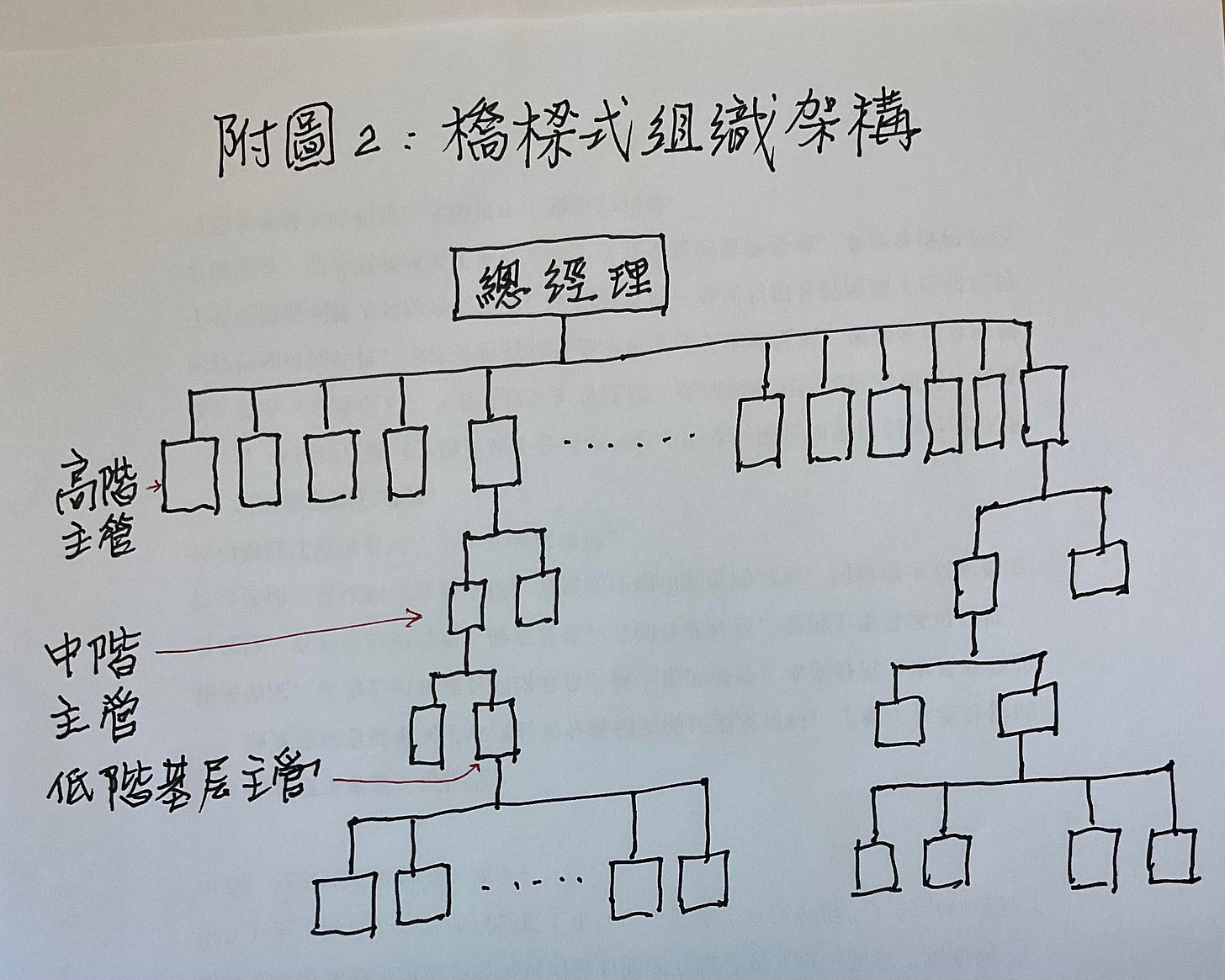 圖2中的總經理,通常管理幅度都會超過10個單位,在這個層級非常扁平,以便掌控一切、凸顯其權力。